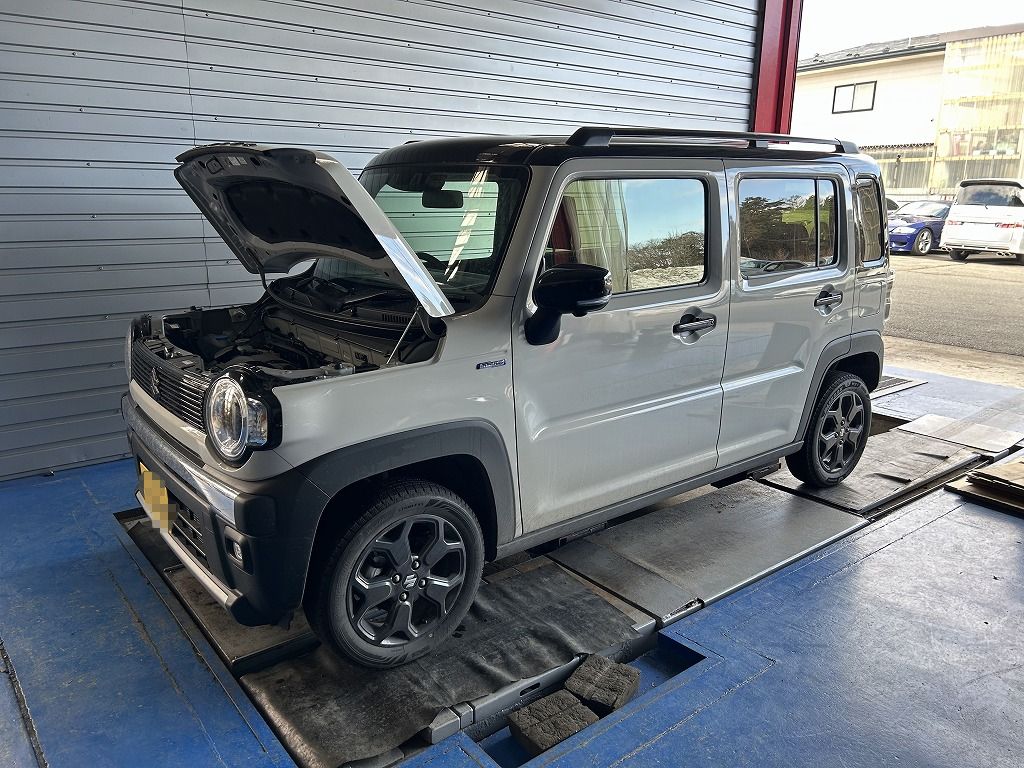 そんな天候の悪いなかですがオイル交換や用品取り付けにご来店いただきました。こちらのフィットはブレーキ回りのメンテナンスでご来店くださいました。
