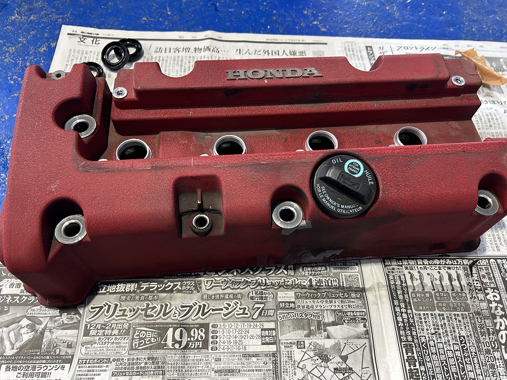 新しいパッキン装着時にへッドカバーも洗浄してお取り付けさせていただきました。劣化による塗装剥離は見られますが赤色の発色が良くなり見た目も少し改善されました。