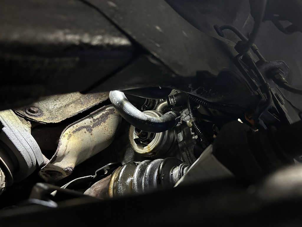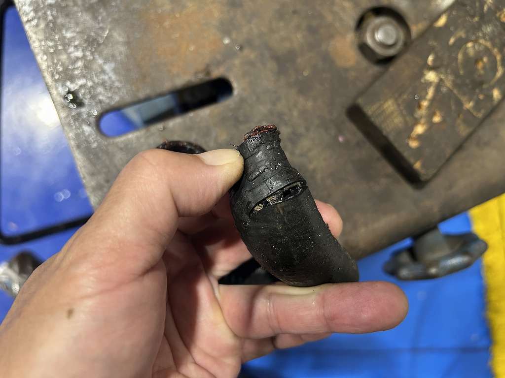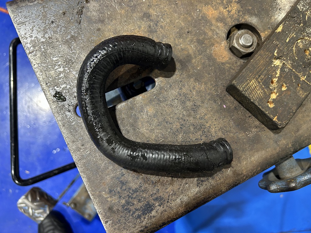 オイルクーラー部のゴムホース劣化により亀裂が生じクーラントが漏れたようです。何とこのホースも生産終了品となっておりました。同ザイズの曲がりホースで対応させていただきました。