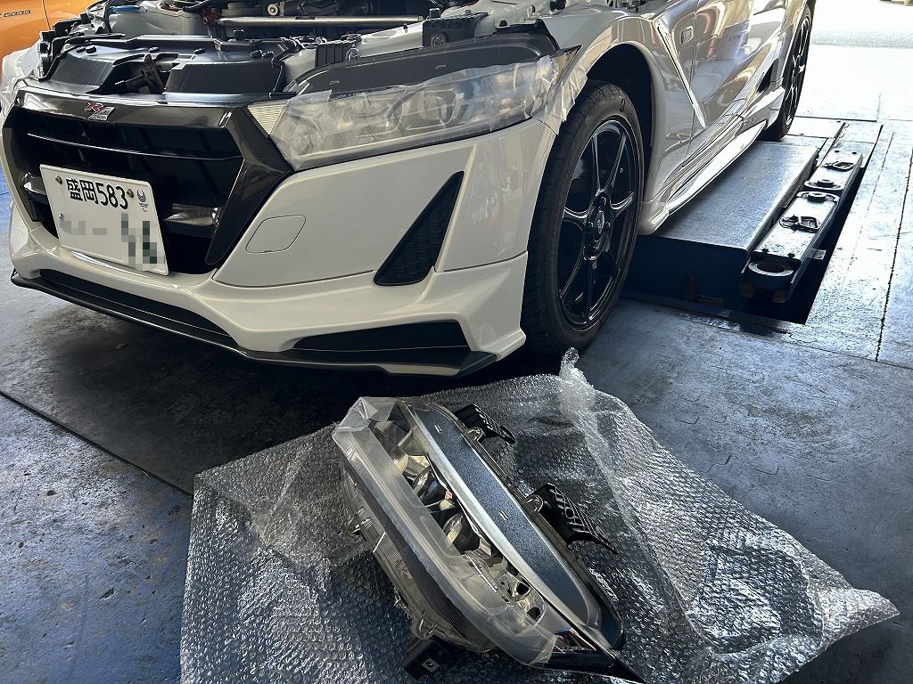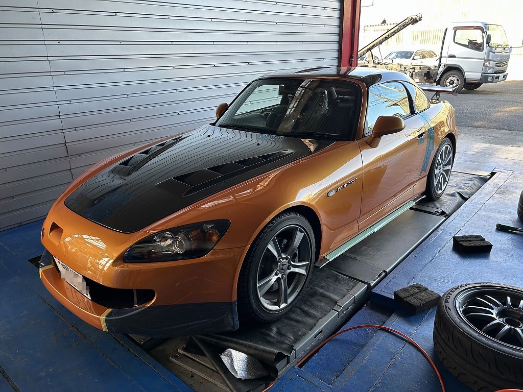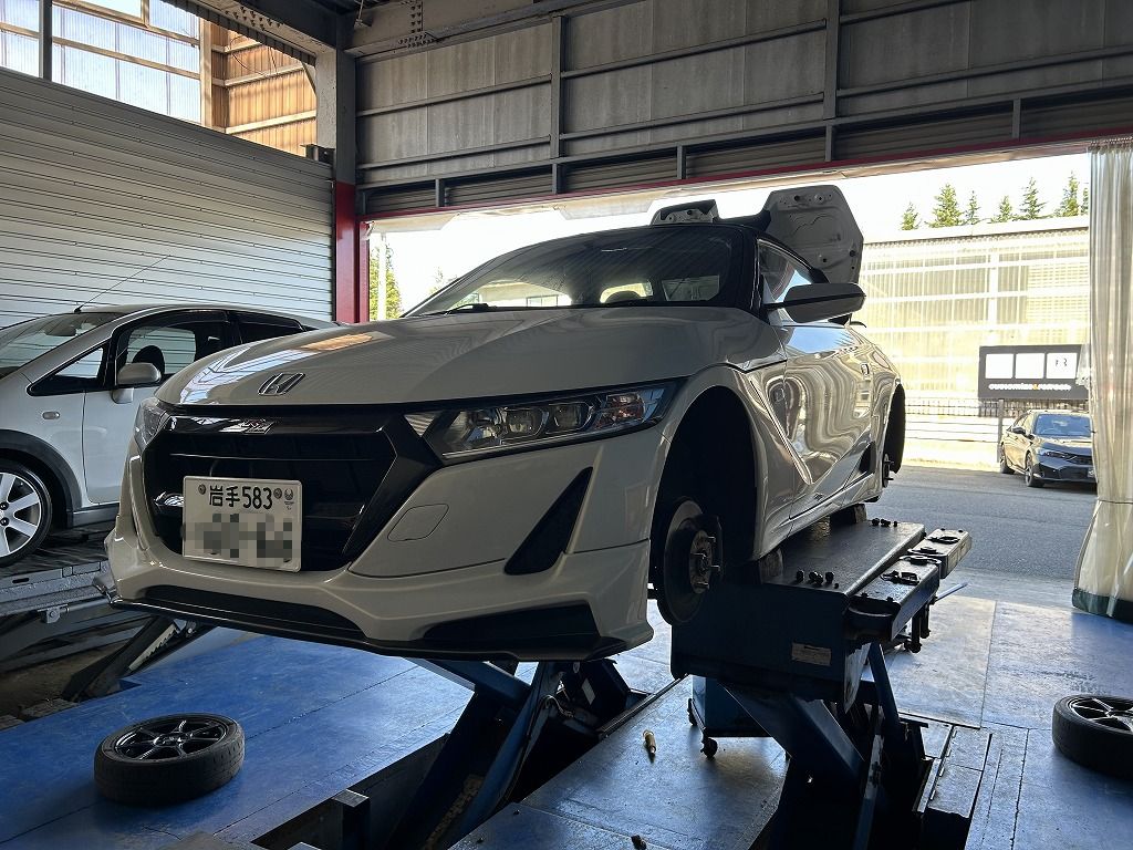 こちらのS2000も車検対応させていただきました。超希少な無限バンパーやボンネット、ハードトップが装着されており腫れ物に触るような感じです・・・汗