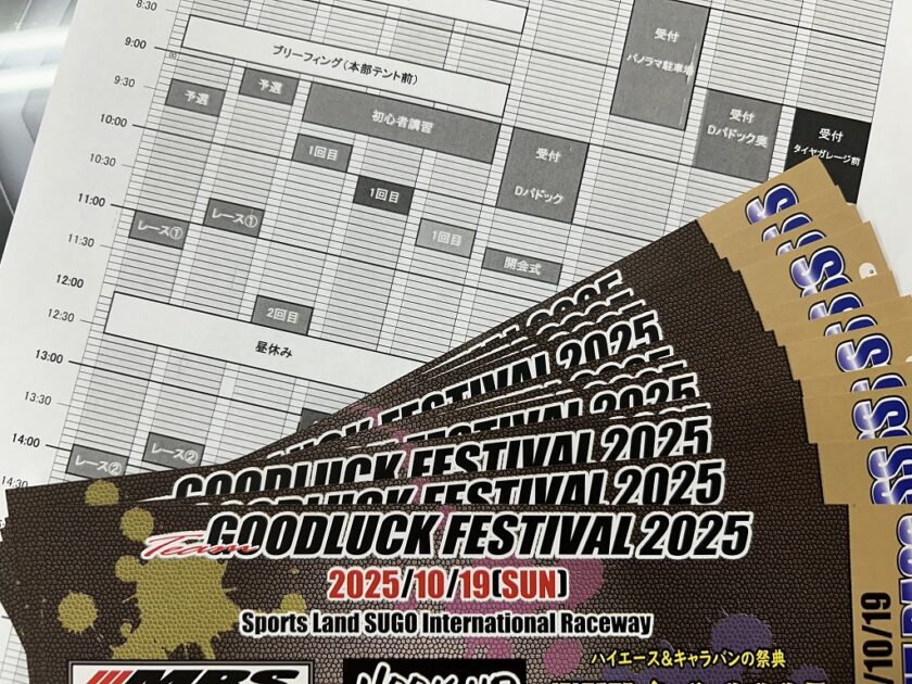ASPAもなくなり恒例のワイワイ走行会開催が保留になっている中ウズウズと走りたい欲が高まりSUGOでの走行会に興味を持たれてる方が増えてます。しか~し平和な?ワイワイ走行会に慣れてる方はSUGOを走る事も他店様の走行会に参加するのもなかなかのハードル。そもそも雰囲気も分からないよねーって事で10/19(日)にSUGOで開催されるGOODLUCK FESTIVAL2025の走行会枠の見学に行こう!という事になりましたので興味のある方はご一緒にいかがですか?若干ですが入場チケットもございます。フリー走行枠は3クラスあってまったりクラスも有るそうです。見学/エントリーどちらかの参加をご検討の方はお気軽にお問合せください。チケット、ある分は無料でお配りしてます。